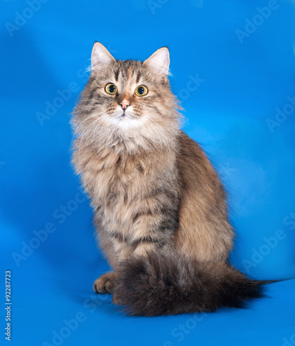 Tricolor cat sitting on blue