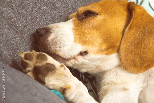 Tricolored adult beagle dog sleeping on couch in bright interior. Canine background.