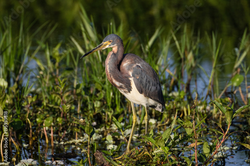 Tri-colored heron at the water's edge surrounded by marsh flora