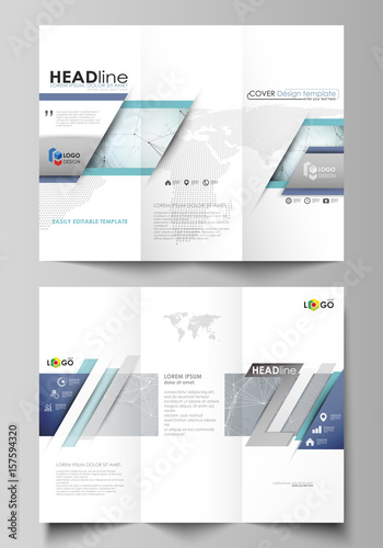 Tri-fold brochure business templates on both sides. Abstract vector layout in flat design. Chemistry pattern, connecting lines and dots, molecule structure, scientific medical DNA research.