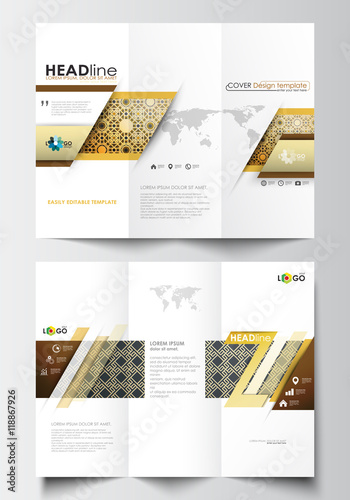 Tri-fold brochure business templates on both sides. Easy editable abstract layout in flat design. Islamic gold pattern, overlapping geometric shapes forming ornament. Vector golden texture.