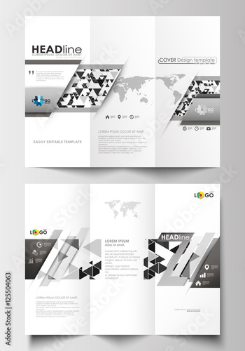 Tri-fold brochure business templates on both sides. Easy editable flat layout. Abstract triangle design background, modern gray color polygonal vector.