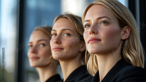 Trio of poised young women in formal black attire, radiating confidence and looking towards the future against a blurred cityscape backdrop with sunlight accents.