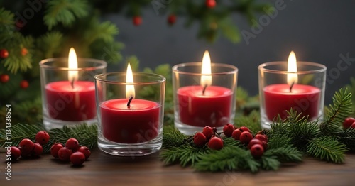Trio of tea lights in glass votives nestled among coniferous branches and clusters of red berries, winter wonderland, tea lights, peaceful ambiance