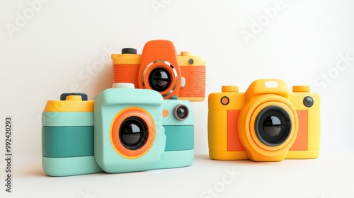 Trio of trendy cameras with playful designs and vibrant colors, isolated on white backdrop