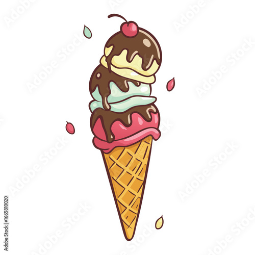 Triple scoop ice cream cone with chocolate drizzle and cherry topping vector