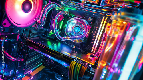 Triple-monitor gaming setup with a water-cooled PC and neon-themed RGB lighting