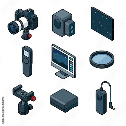 Tripod dslr shutter field astro photography telescope backup icon cable clamp vector