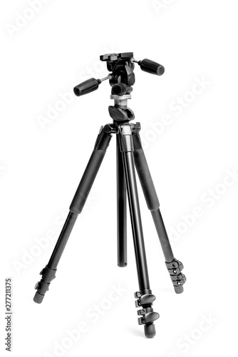 tripod for photo camera in photo studio on white background close-up