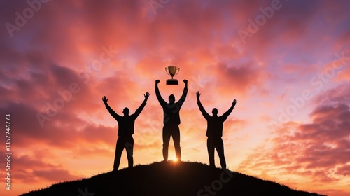 Triumphant Business Team Celebrating Victory on a Hill Against a Dramatic Sunset Sky