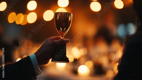 Trophy presentation at corporate gala, spotlight on recipient, elegant scene