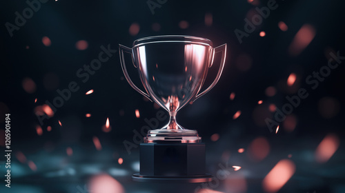 Trophy shining brightly on a dark background with sparkling particles, 3d illustration