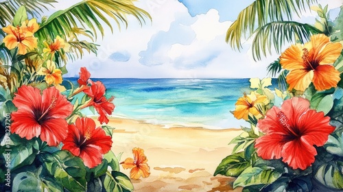 tropical background with hibiscus flowers and palm leaves on a sunny day