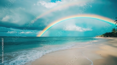 Tropical Beach Paradise: A Stunning Rainbow over Turquoise Waters