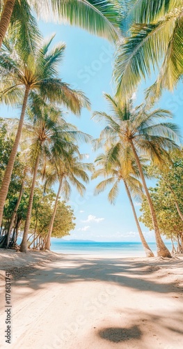 Tropical beach path, palm trees, ocean view, sunny day, vacation