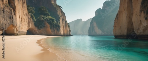 Tropical beach scene with clear turquoise water and rocky cliffs under a bright sky during daytime