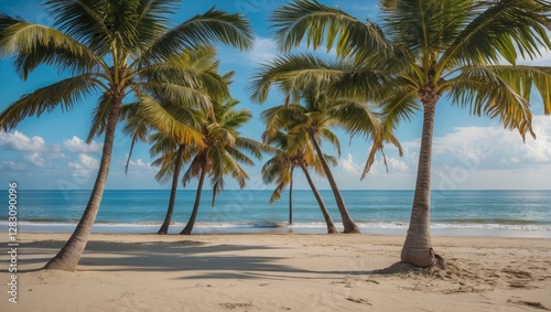 Tropical beach scene with palm trees framing the ocean and sky with clouds in the background Copy Space