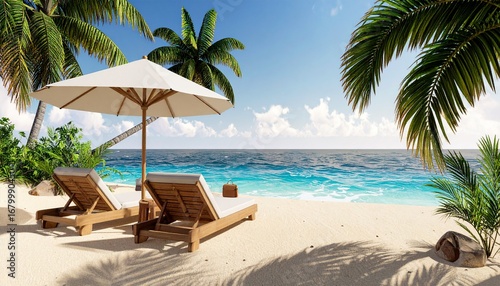 Tropical beach travel theme in summer, 3d rendering. 3D illustration