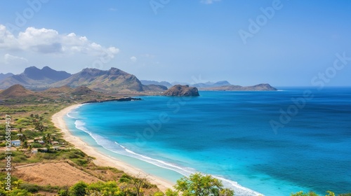 Tropical beach vista, azure waters, mountains, secluded paradise