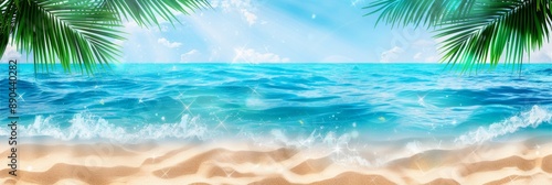 Tropical beach with ocean waves and palm leaves, blank space for text, ideal for advertising