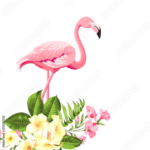 Tropical birds and flowers illustration. Fashion summer print for wrapping, fabric, invitation card and your template design. Vector illustration.