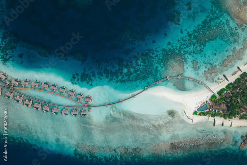 Tropical coast with sandy beaches, resort water villas, and vibrant coral reefs