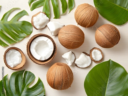Tropical Coconuts and Lush Green Leaves Flatlay