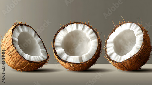 Tropical Delight, Three Halved Coconuts Displayed, Showcase of Exotic Fruit's Interior and Texture.