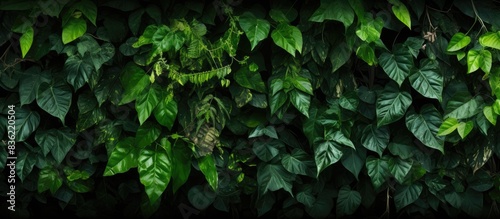 Tropical fiddle leaf philodendron plant climbing a rainforest tree trunk with green leaves and vines, set against a white background with clipping path image available. Copy space image