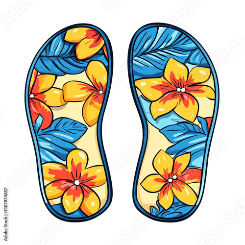 Tropical flip flops with vibrant flowers and blue leaves summer vacation design