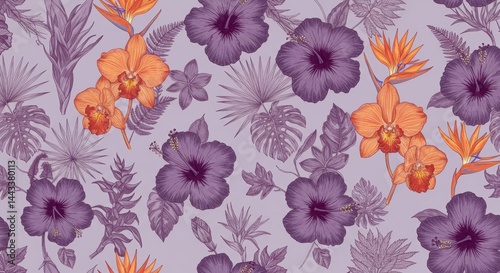 Tropical Floral Pattern Background: Purple Hibiscus Flowers Orange Orchids Bird of Paradise Seamless Design