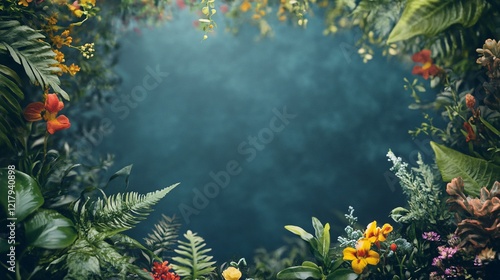 Tropical flowers and plants creating a vibrant jungle border on teal background