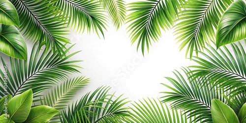 Tropical foliage arranged in a frame on a white background, showcasing the vibrant green hues and intricate textures of nature.