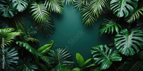 Tropical foliage background with lush green leaves including Monstera and palm fronds on a dark green backdrop