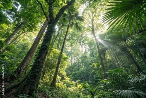 Tropical forest canopy with sunlight filtering through, jungle, foliage, green gradient