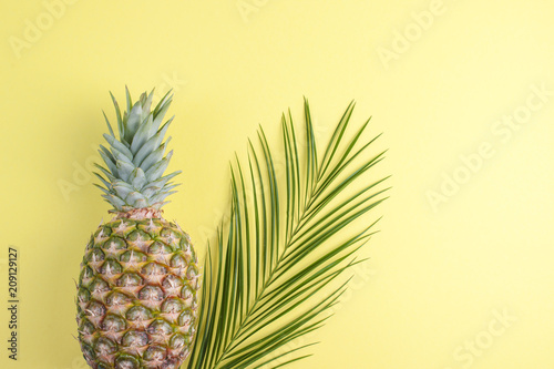 Tropical fruit of pineapple and palm branch on a yellow background. Free space for text. Copy space. flat lay. above.