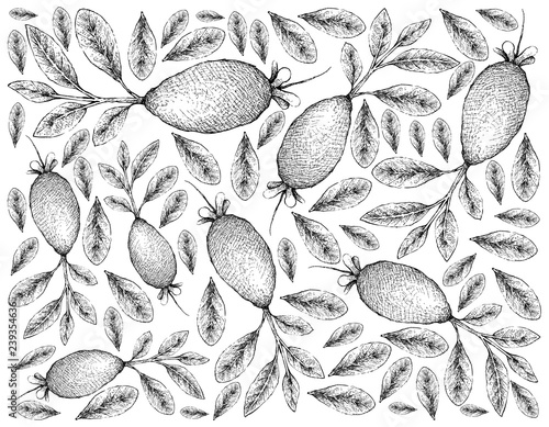 Tropical Fruits, Illustration Wallpaper of Hand Drawn Sketch Guavasteen, Feijoa or Acca Sellowiana Fruit Isolated on White Background.
