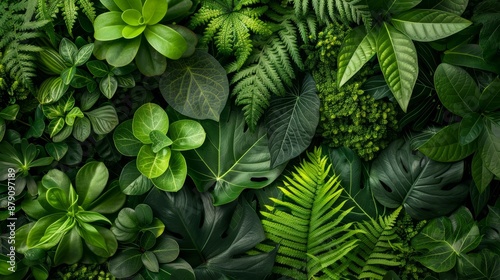 Tropical Green Foliage Background. Lush,Vibrant Greenery with Various Leaf Textures and Shapes. a concept for Nature,Eco,and Summer Designs.