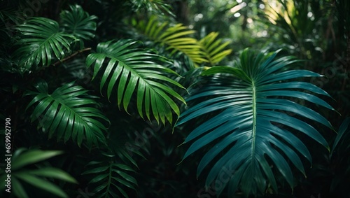Tropical green tree leaves pattern frame on natural exotic palm forest. Abstract jungle background