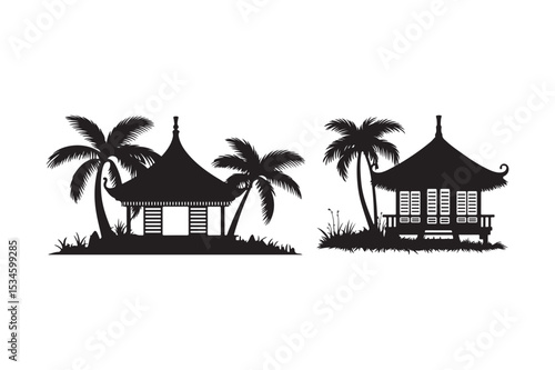 Tropical Hut Silhouette Vector Set Palm Tree and Beach Bungalow Black Isolated Design