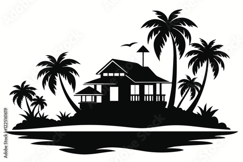 Tropical Island and Beach House Silhouette Clipart