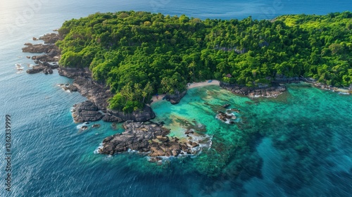 Tropical island paradise with turquoise waters. Lush greenery covers the island, meeting the crystal-clear, turquoise water. Rocky coastlines surround a secluded cove