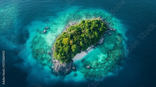Tropical island surrounded by coral reef and turquoise water in southeast asia
