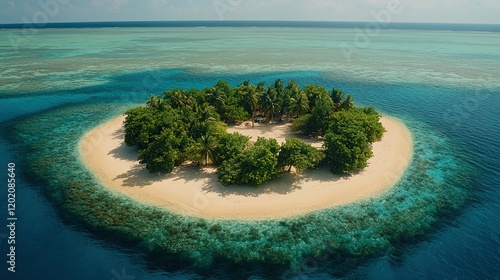 Tropical island with lush vegetation, sandy beach, surrounded by coral reef in turquoise ocean