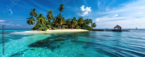 Tropical island with palm trees, serene and inviting, Coastal, Bright hues, Photograph, Paradise