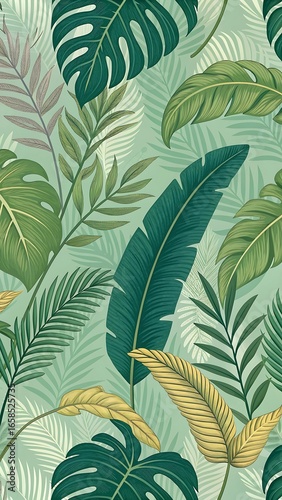 Tropical Jungle Leaf Pattern Wallpaper Lush Green & Gold Foliage Design