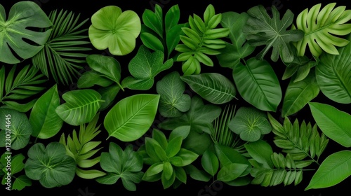 Tropical Leaf Collage: A vibrant collection of lush green tropical leaves, forming a rich and textured background perfect for design projects.