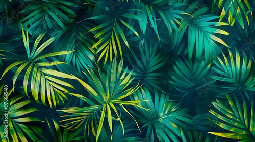 Tropical leaf pattern in vibrant green and turquoise, creating a fresh, natural atmosphere.