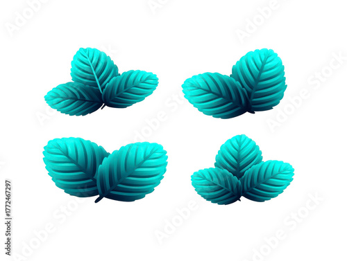 Tropical leaf set, digital illustration, featuring four blue green leaves with soft shadows, isolated on transparent background, perfect for design, nature, and decoration projects