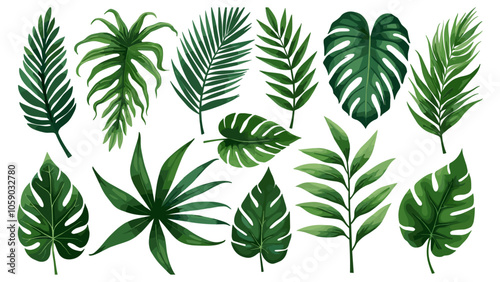Tropical leaves set. Collection of exotic plants: Caladium, Fatsia, Calathea, Alocasia, Howea, liane. Vector foliage elements isolated on a white background. Realistic botanical illustration.